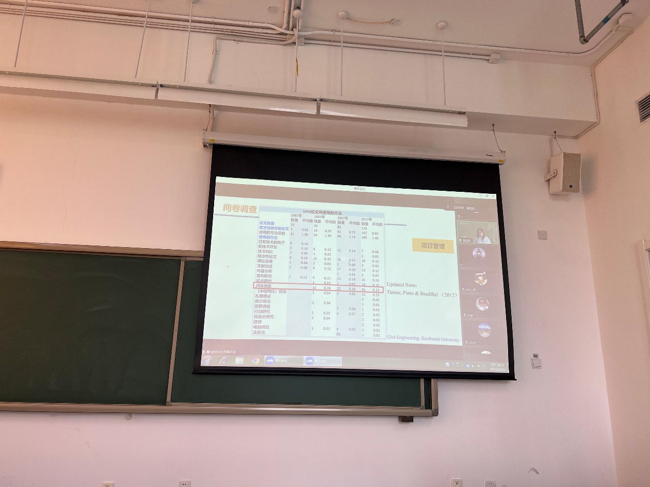 2023年11月21日上午,于沙河二教208,东南大学夏妮妮副教授应邀在建设经济与管理系列论坛上作主题为《工程项目管理情境下问卷调查论文的分享与思考》的线上报告。报告由公司建设经济与管理系助理教授吴国滨主持,23级工程与项目管理专业研究生参与本次主题报告。