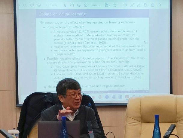 邓永恒教授首先简述了城市可持续发展所面临的挑战和问题,指出收入和教育不平等对经济增长的制约,而大城市中高房价和收入不平等问题的根源在于教育差异。随后进行了题为《在线学习与教育差距:数字足迹方法》的学术报告,该研究以新冠疫情期间中国广东省21个城市的公司停课为背景,分析了在线学习对教育差距的影响。邓永恒教授及研究团队提出了一种基于智能手机使用的数字足迹方法,识别出小学毕业子女(小升初)的家庭的升学情况,基于其居住地房价和购物行为量化家庭经济状况。研究发现,来自条件较好家庭的孩子的优势会随着公司关闭时间的延长而增加,也就是说在线教育扩大了教育差距,而父母不同的应用程序使用习惯是导致教育差距的扩大的机制。邓教授还与在场师生进行热烈交流,耐心为大家答疑解惑。
