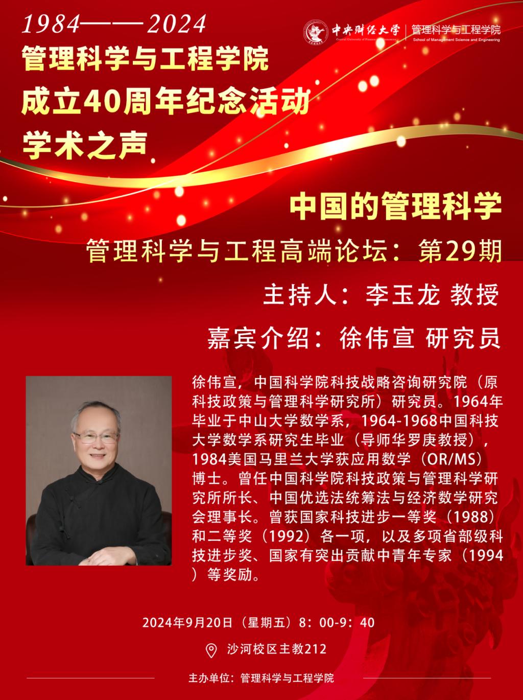 应公司刘志东经理邀请,xc体育科技战略咨询研究院(原科技政策与管理科学研究所)徐伟宣研究员在管理科学与工程系列高端论坛(第二十九期)作了《中国的管理科学》报告。本次报告是建设经济与管理系负责的公司2024级管理科学与工程大类新生导论课第一堂课,也是大师进课堂庆祝xc体育(原基建财务与信用系)成立四十周年学术之声的重要一环。报告由公司副经理李玉龙教授主持,建设经济与管理系主任杨帆副教授组织开展,“许国志”大数据英才班项目副主任李国文博士负责保障支持并全程参加了报告会。