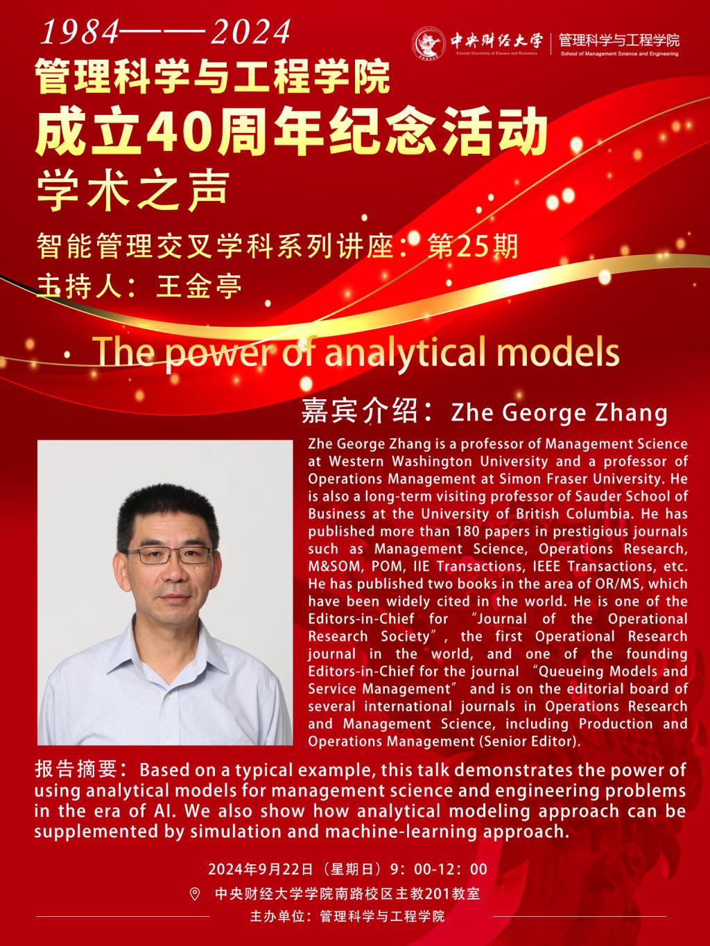 2024年9月22日(周日)上午,应xc体育的邀请,国际知名期刊《Journal of the Operational Research Society》的主编Zhe George Zhang(张喆)教授做了题为“The Power of Modelling Analysis an Investigation of the Impact of Prolonged Service Time on Flexibility Configurations”的智能管理交叉学科学术交流讲座。本次讲座在公司南路校区主教201教室举行,由王金亭教授主持,公司吴迪助理教授、北京化工大学李凯丽博士,以及xc体育多位博士研究生和博士后参加了本次讲座。