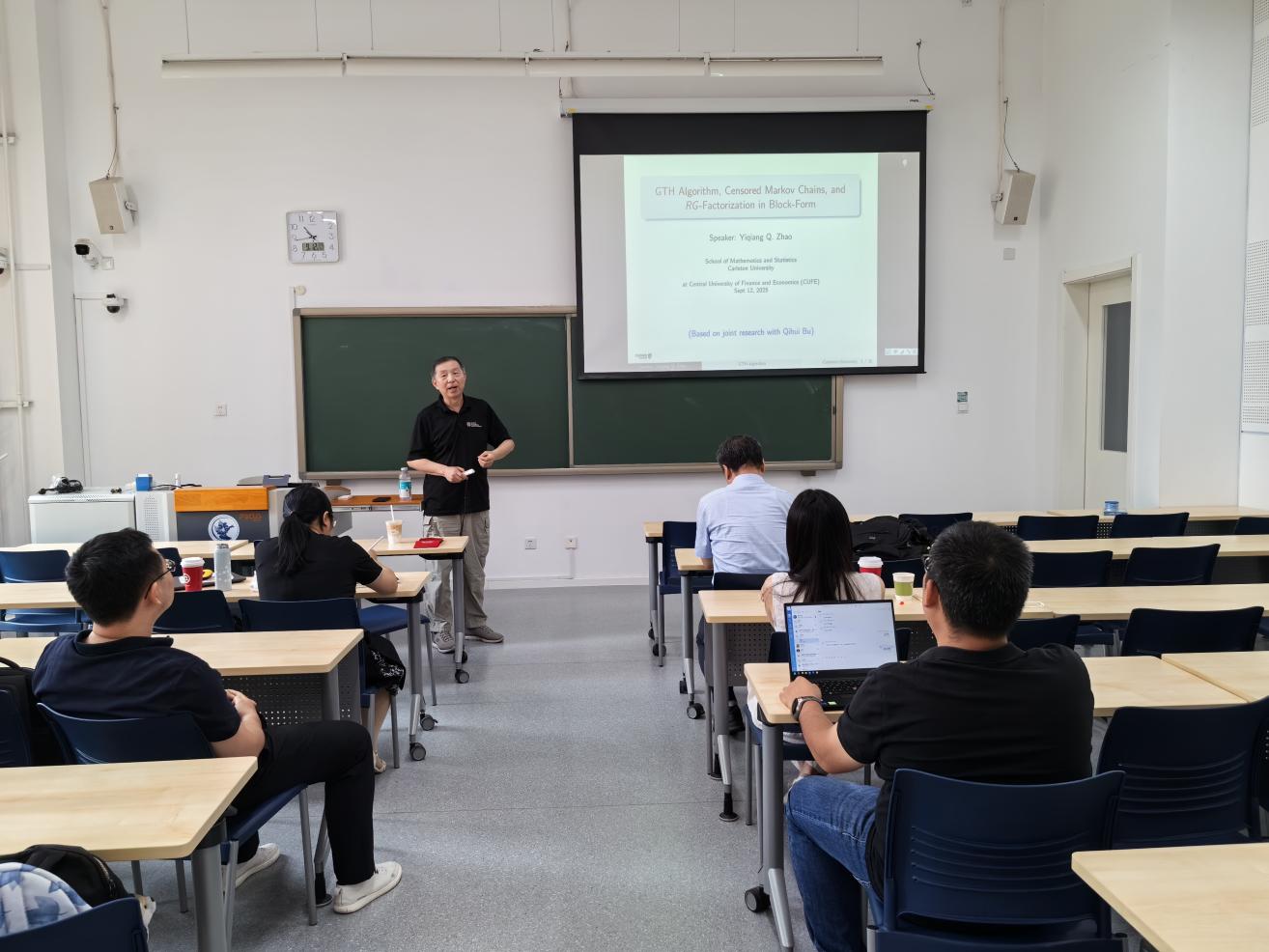 2025年9月12日(周五)上午10:30-11:30,应xc体育的邀请,加拿大卡尔顿大学理公司终身正教授赵以强(YiqiangQ. Zhao)博士做客智能管理交叉学科系列讲座(第33期),带来了题为“GTH Algorithm, Censored Markov Chains, and RG-Factorization in Block-Form”的学术报告。本次讲座在xcsports沙河校区二教113教室举行,由公司王金亭教授和统计与数学公司张美娟副教授共同主持,公司多位老师及博士生参加了本次讲座。