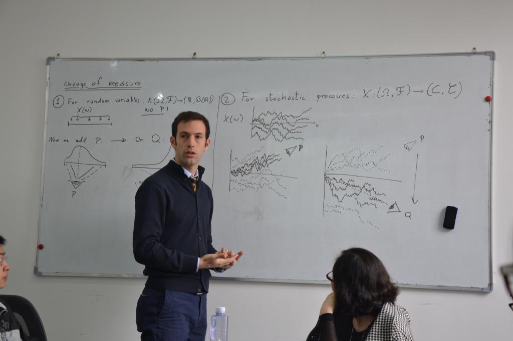 有课,因此原定于24日的讲座改为25日上午举行。在25日上午的讲座中,Bedini博士结合两个比较有特点的实际例子解释了先前介绍的数学知识该如何应用。第一个例子比较了在对基本期权使用局部波动率和经典BS公式进行定价之间的区别,第二部分则介绍了护照期权的不同定价方式。