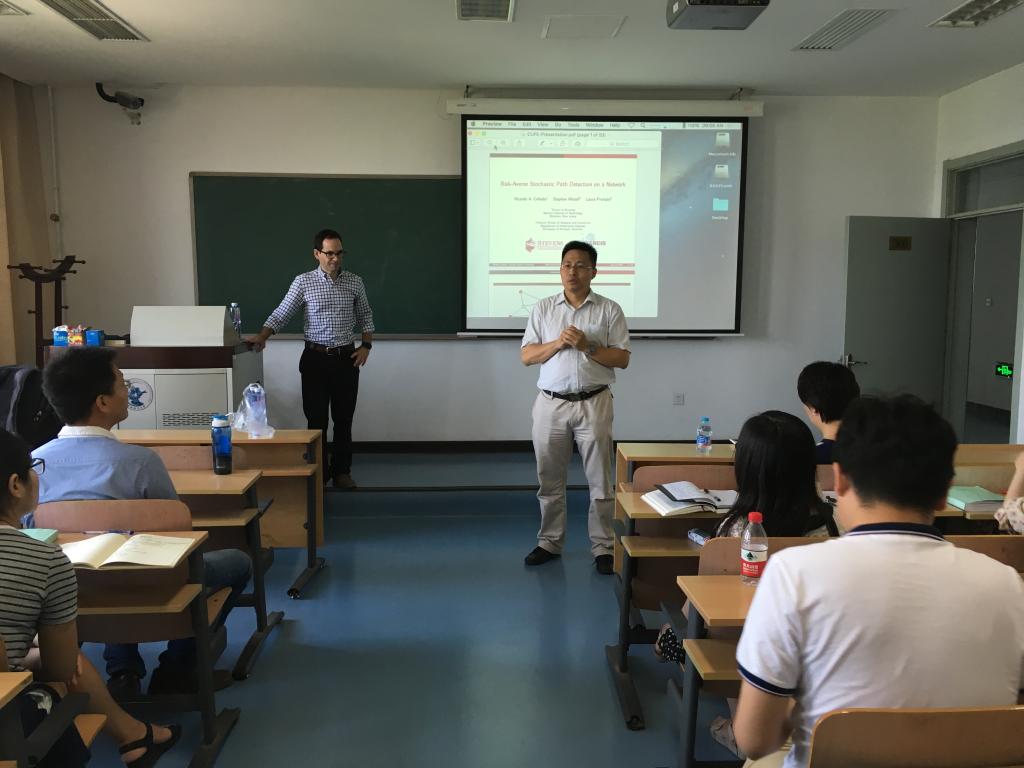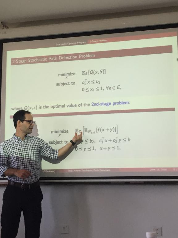访问期间,Ricardo副教授于2016年6月16日上午9:00-10:00在xcsports沙河校区西区主教学楼506教室面向老师和员工们做了题为《Risk-Averse Stochastic Network Interdiction》的公开讲座。