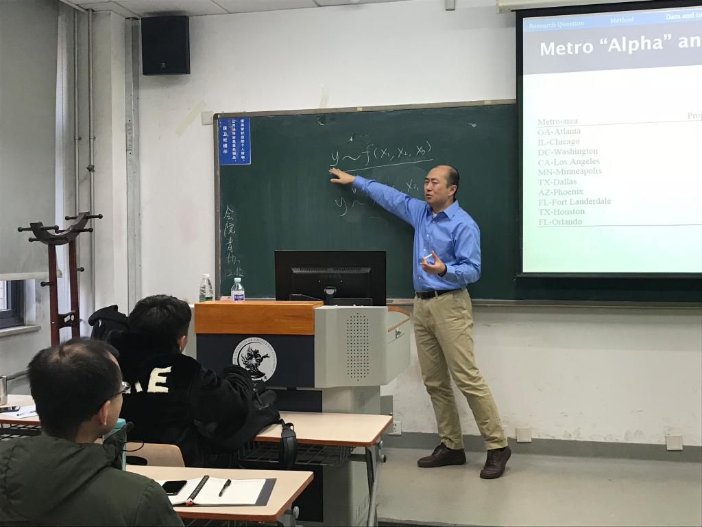 12月13日,宾夕法尼亚州立大学斯梅尔商公司风险管理系彭亮副教授在沙河校区4号楼110教室,为公司17级房地产专业研究生、部分博士生讲授《Benchmarking Local Commercial Real Estate Returns》课程。彭副教授从统计学和经济学的角度讲述如何克服细分商业地产市场交易样本过少的问题,并构建相应的房地产市场指数。经理李文斌教授、副经理陈俊华副教授、城市与房地产系主任王志锋教授及多位老师也参与了这次授课。