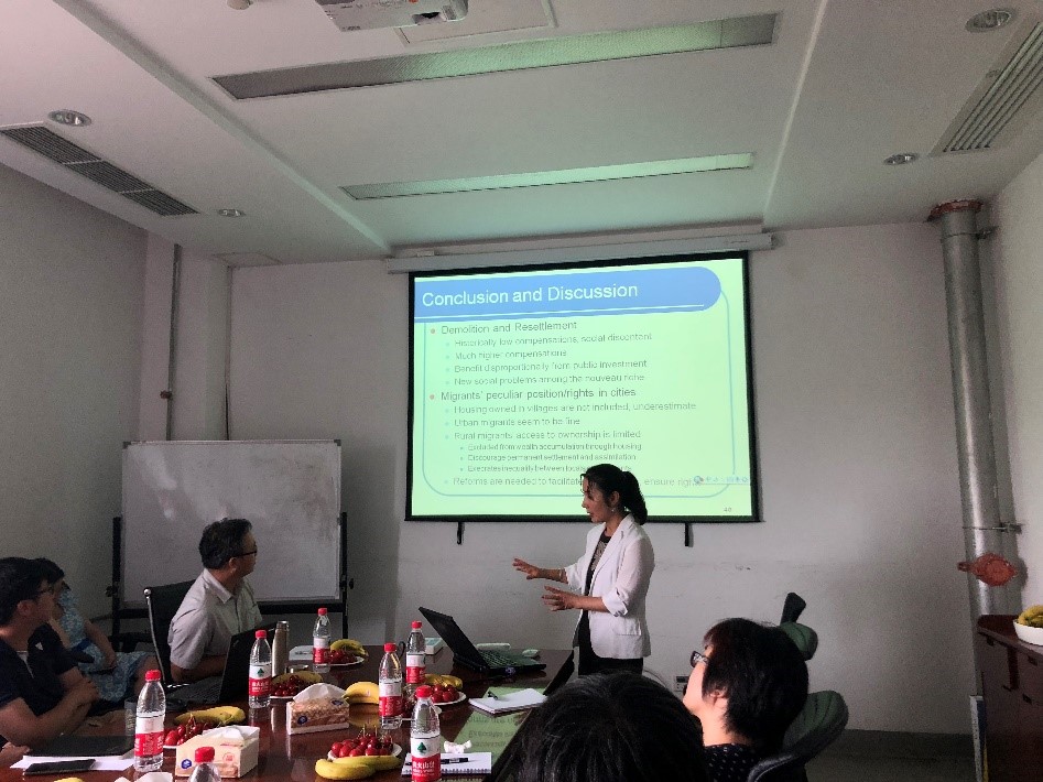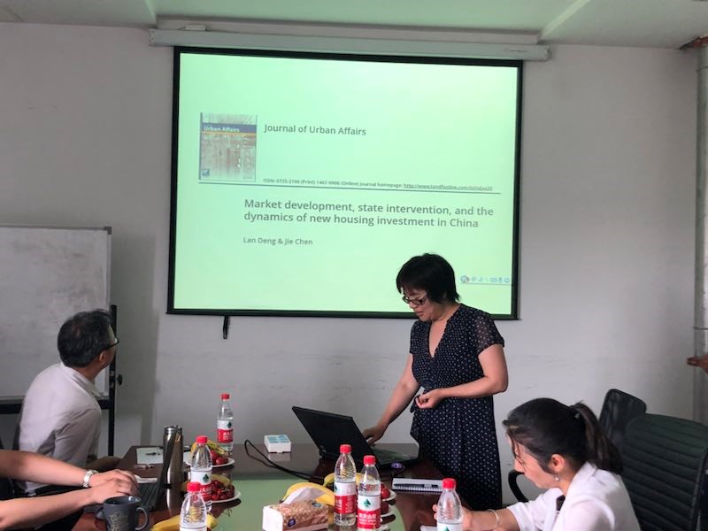 两位教授授课结束后,讨论环节气氛十分热烈。各位老师针对授课内容进行了提问,并发表了自己的看法和建议,两位教授表示十分受益。授课结束后,由公司王昊副教授和王优容副教授、任建宇和李玉瑶博士生做学术汇报,题目分别为《城市更新下的居住用地再开发的时空机制及经济社会效应》、Urban-rural Housing Disparity in China、《市场深化进程中的多套住房》以及《京沪宁杭住房和城乡建设管理比较指标体系研究》。Youqin Huang和Lan Deng教授以及在座的其他老师聆听后给出了宝贵的修改意见和建议。