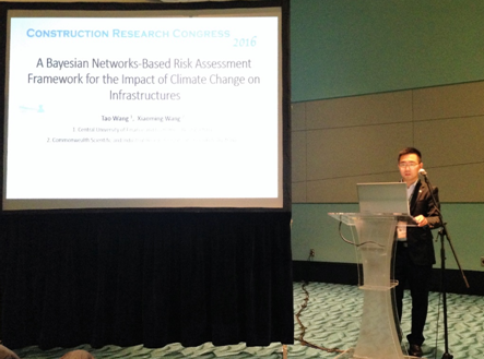 2016年5月30日——6月4日,xc体育汪涛博士赴波多黎各圣胡安市参加了2016美国建设研究大会(2016Construction Research Congress, CRC)。并在会议上做口头主题报告“基于贝叶斯网络的气候变化影响基础设施风险评估框架”(A Bayesian Networks-Based Risk Assessment Framework for the Impact of Climate Change on Infrastructures)。论文讨论了气候变化影响基础设施风险评估管理的特征和要求,以及贝叶斯网络方法的优点和适用范围,分析得出采用贝叶斯网络方法构建风险评估模型的可行性和适用性,建立了风险评估框架流程,并应用案例进行了基本说明。