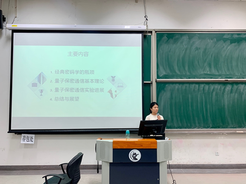 在量子保密通信基本理论部分,田国敬为同学们解释了量子的概念、量子态、量子态的向量描述以及量子保密协议中的经典协议——BB84 QKD协议,并带领同学们进行了简单的推导计算。同时,在分析与解释量子基本理论的基础上,田老师还解释了量子的隐形传态以及隐形传态的相关知识。