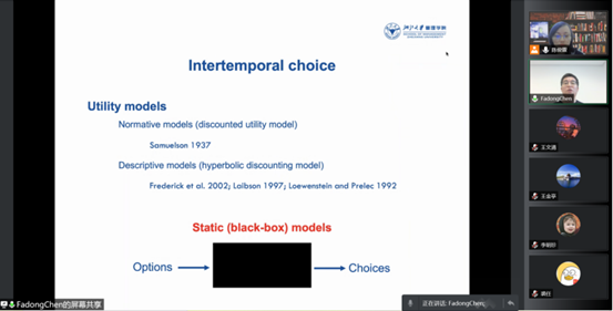 2021年6月18日(周五)下午14:00—15:30,浙江大学管理公司陈发动研究员在线上开展了题为“Attribute Latencies Causally Shape Intertemporal Preferences”的学术交流讲座。讲座由管理科学系陈俊霖老师主持,xc体育副经理王金亭,管理科学系郭建老师,以及xc体育硕士研究生与部分本科生同学聆听了讲座。