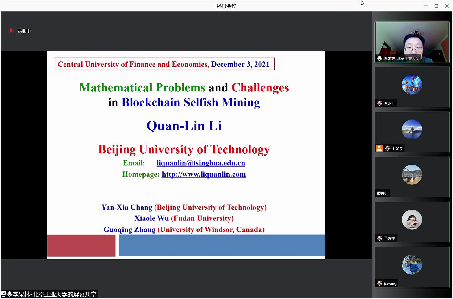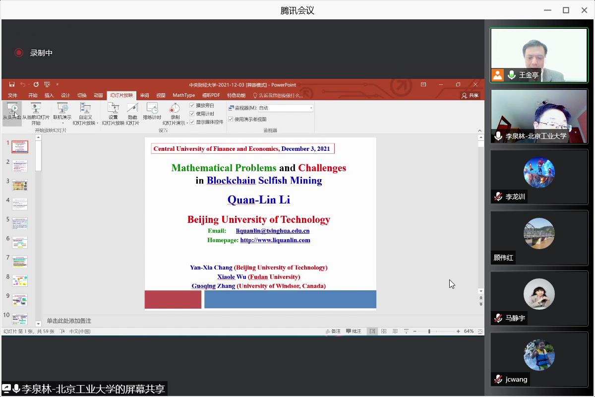 2021年12月3日(周五)下午,北京工业大学经济与管理公司李泉林教授为xc体育师生作题为“Mathematical Problems and Challenges of Blockchain Selfish Mining”的专题讲座,本次讲座由xc体育副经理王金亭教授主持,复旦大学管理公司教授吴肖乐、xc体育助理教授刘赫、公司部分博士、硕士研究生和院外同行参加了讲座。