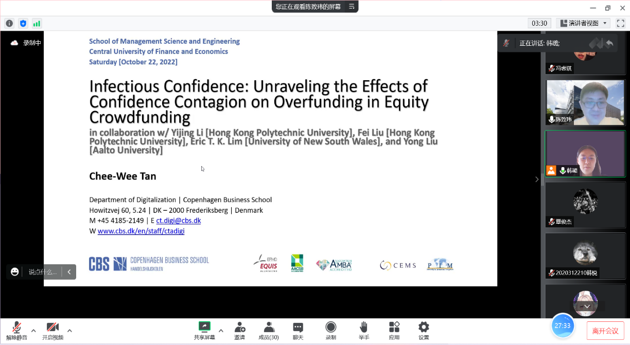 2022年10月22日下午三时,哥本哈根商公司陈致玮教授应邀为公司师生开展了一场题为“Infectious Confidence: Unraveling the Effects of Confidence Contagion on Overfunding in Equity Crowdfunding”的学术讲座。本次讲座由公司韩璐副教授主持,近50位本科生以及硕士研究生参与了此次讲座。