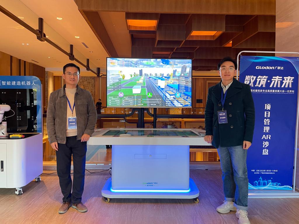 会场大厅布置了广联达工程项目管理AR沙盘、智能建造机器人等设备。会议间歇,广联达工作人员详细介绍了设备功能与应用场景,并进行了现场演示,与会人员大多进行了操作演练。