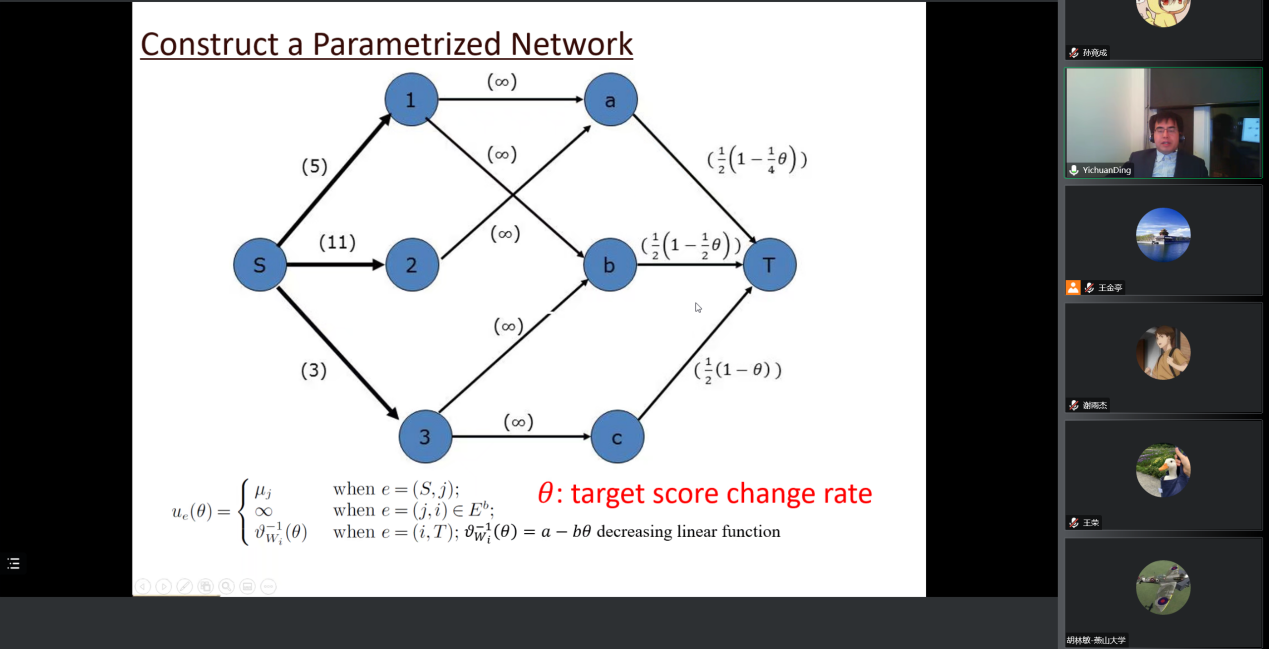 王金亭教授致欢迎辞,介绍了丁弋川副教授的教育背景和研究经历,欢迎丁弋川副教授就其投稿于顶级期刊Operations Research上的研究工作线上给与会师生和国内学者介绍资源顾客匹配问题的前沿研究,加强学术交流与合作。丁老师对中财xc体育的邀请和王金亭教授的介绍表示感谢。