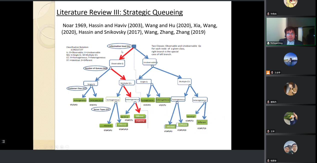 丁老师的讲座内容丰富,条理清晰,前沿性强。在讲座交流环节多位参会者向丁老师请教了有关不同场景匹配资源和顾客的相关问题,丁老师依次做了的详细的解释和说明,现场互动交流氛围热烈。与会者均表示对双边匹配的研究有了更全面更深刻的认识,受益匪浅。讲座最后,王金亭教授表示非常有幸可以邀请到丁弋川老师为各位师生学者做线上讲座,并对丁老师抽出宝贵时间表示感谢,希望之后有机会可以再次邀请丁老师前来做学术讲座。