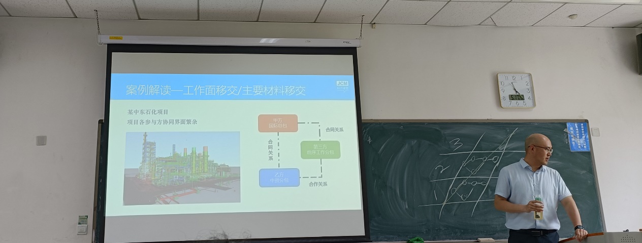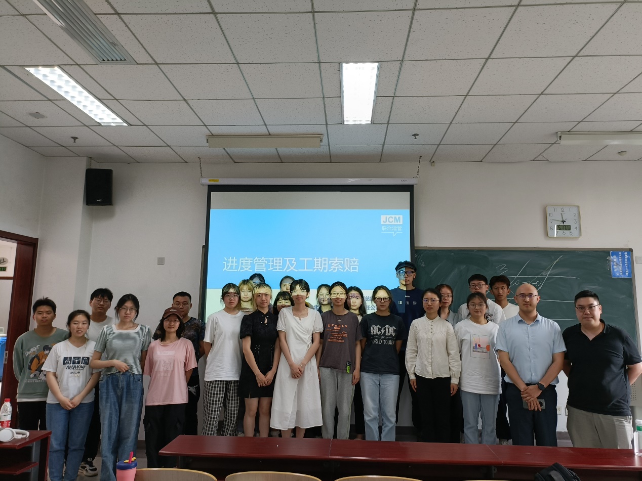 2023年5月17日上午,沙河主教307教室,联合建管(北京)管理咨询有限责任公司副总经理刘磐应邀在建设经济与管理系列论坛上做了主题为《进度管理及工期索赔》的讲座。讲座由公司建设经济与管理系主任杨帆副教授主持,工程管理专业21级本科生参加了讲座。