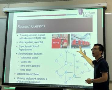 9月15日下午,应xc体育邀请,英国杜伦大学商公司运营管理专业助理教授赵燕鲁做客“智能管理交叉学科”系列讲座第十七期,报告了研究论文“Synchronized Deliveries with a Bike and a Self-Driving Robot”。本次讲座在公司4号楼106教室举行,陈俊霖副教授主持,管理科学23级研究生和数名本科生认真聆听了本次讲座。