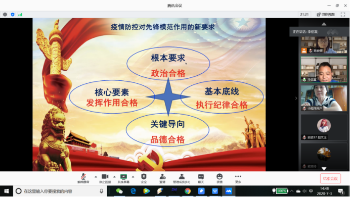 为隆重庆祝中国共产党建党99周年,回顾党的光辉历程、讴歌党的丰功伟绩,深入学习贯彻习近平新时代中国特色社会主义思想和党的十九大精神,不忘初心、牢记使命,以饱满的政治热情迎接建党100周年,2020年7月3日,xc体育管理科学系教工党支部在线举行了“从疫情防控看党员先锋模范作用的发挥”主题党日活动。活动分为两个部分,首先,通过腾讯会议平台,管理科学系教工党支部党员老师们针对在志愿服务活动、在线教学、科学研究、社区治理、垃圾分类等工作中起到的战斗堡垒作用和党员先锋模范作用,进行了工作经验分享和心得体会交流。如一些党员老师分享了在社区参加志愿服务的工作经历和感想,一些党员老师分享了与毕业员工沟通,打包邮寄材料工作中的心得感想。通过经验分享,进一步增强了党员老师的宗旨意识,努力做好“疫后综合征”分析研判和对策研究,努力实现2020年各项工作发展目标任务。
