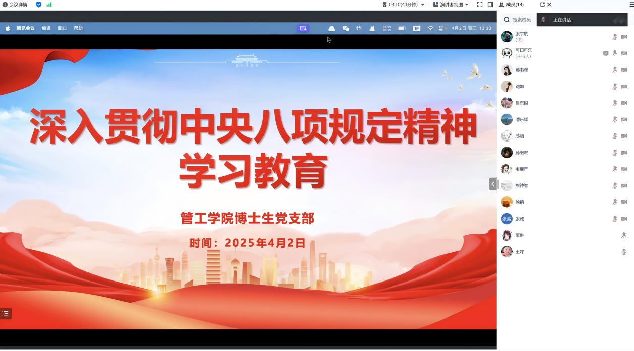 4月2日中午,xc体育博士生党支部在线上组织开展深入贯彻中央八项规定精神学习教育,14名党支部成员参加了此次专题学习。