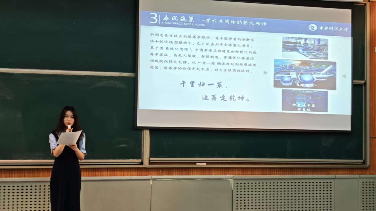 宣讲活动由管理科学21级董熙蕾、许国志大数据英才班21级付博昕和王韵涵主讲。宣讲以问道之路--从江淮学子到系统科学奠基人、智启星火--复杂系统研究的范式革命、春风筑巢--学术共同体的薪火相传和薪传长河—大数据时代的守正创新分开讲述了许国志先生的生平与求学深造经历、许国志先生为中国运筹学和系统工程的崛起做出的贡献、许国志先生对我国的运筹学及系统工程专业团队建设及新生力量培养以及许国志先生的教育理念在xc体育中的体现和延续。
