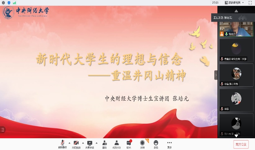 首先,博士生党支部书记张培元以“新时代老员工的理想与信念——重温井冈山精神”为主题,从五个方面介绍了井冈山精神的内涵,回顾井冈山的历史,他强调了坚定信念、艰苦奋斗,是井冈山精神的灵魂;实事求是、敢闯新路,是井冈山精神的核心;依靠群众、勇于胜利,是井冈山精神的基石。