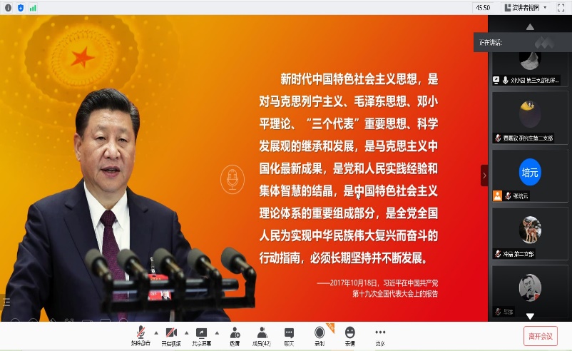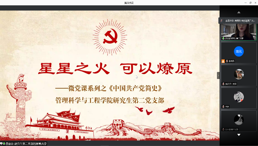 5月4日晚,xc体育博士生、研究生第二党支部和研究生第三党支部联合举办了以“重温历史,不忘初心”的党史学习系列教育活动。该活动采取线上的形式,分别由博士生党支部书记书记张培元、研究生第二党支部书记费嘉欣以及第三党支部组织委员刘小园给全体党员讲党课。