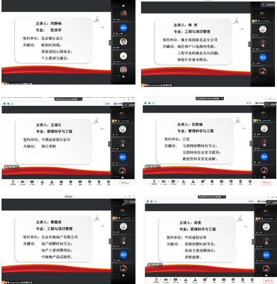本次交流会采取线上方式进行,2019级研究生结合自身的求职经历分别介绍了公务员、银行、证券、保险、地产、互联网等行业招聘情况。签约北京银行总行的2019级投资学硕士刘静杨对银行秋招时间线做了梳理,结合自身经历向同学们提出了宝贵的意见与建议;签约瑞士再保险北京分公司的2019级工程与项目管理硕士林杰对求职地区及户口选择问题进行了分析,对保险行业做了较为全面的介绍,同时对工程与项目管理专业毕业生去向进行了分享;签约中国建设银行总行的2019级管理科学与工程硕士王迪文对银行招聘流程进行了详细介绍,并对银行重点考察的专业素质进行了剖析;签约北京市委办公厅的2019级工程与项目管理硕士苏划对公考时间节点、公考员岗位选择和公务员考试复习要点等方面进行了细致梳理;签约百度公司的2019级管理科学与工程专业任胜楠对互联网招聘的时间节点、互联网岗位及实习留用、秋招资料及常见误解进行了分享;签约北京中海地产有限公司的2019级工程与项目管理硕士费嘉欣对地产招聘时间节点、地产招聘主要岗位以及中海地产面试流程进行了详细讲解;签约中信建投证券的2019级管理科学与工程硕士高宽对券商招聘时间点、券商招聘主要岗位以及求职感想进行了分享。