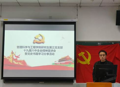 会议第三部分,为深入开展系列党史学习教育,研究生第三党支部在11月进行了党史、新中国史、改革开放史、社会主义发展史的专题学习活动,并于本次会议当天进行学习成果分享。各小组成员分别从不同角度对中国共产党成立100周年以来的重大历史事件进行回顾,并结合实际分析其现实意义,以史为鉴,切实增强在实践中守初心、担使命的思想自觉和行动自觉。