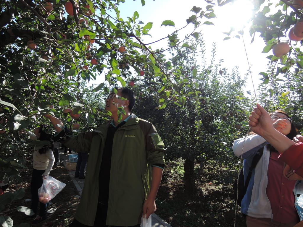 深秋十月,碧空如洗。10月13日下午,xc体育工会组织全院教职工到昌平采摘苹果。持续多日的雾霾散尽之后的北京秋高气爽,老师们抛开被雾霾压抑的晦暗心情和平日教学科研工作的繁重压力,来到昌平的采摘园体验果园劳作的乐趣。有的老师采摘经验丰富,通过形状、果皮颜色等等就能判断苹果的好坏,有的年轻老师则完全不了解这些知识,基本上是“盲摘”。采摘过程中,老师们一边摘、一边吃,乐趣无穷。