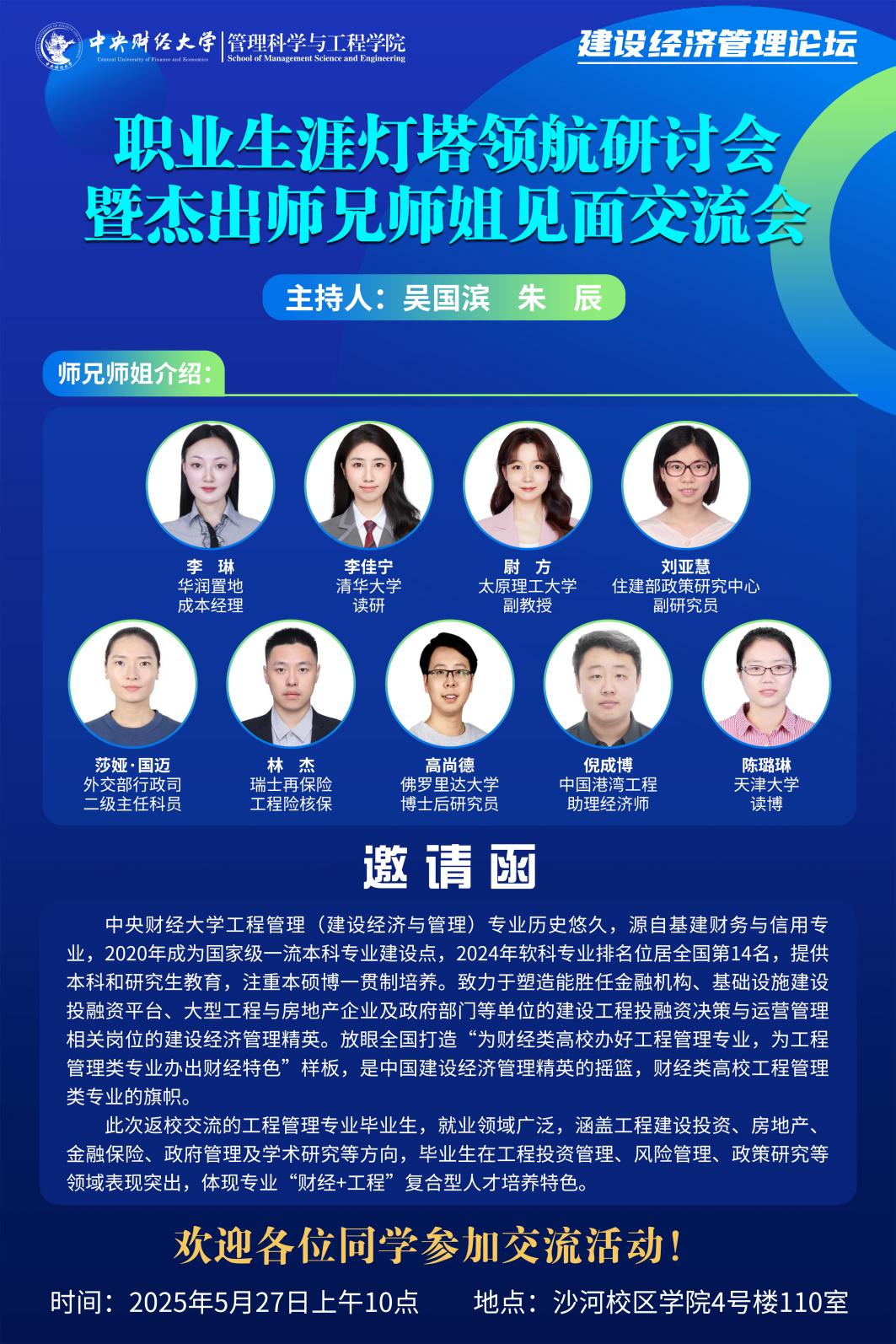 活动邀请到来自不同领域的杰出员工,包括华润置地成本经理李琳、太原理工大学副教授尉方、住建部政策研究中心副研究员刘亚慧、外交部行政司二级主任科员莎娅·国迈、瑞士再保险工程险核保林杰、佛罗里达大学博士后研究员高尚德、中国港湾工程助理工程师倪成博、天津大学博士生陈璐琳、清华大学在读研究生李佳宁。在交流环节,工程管理专业的本科生们踊跃提问,内容涵盖升学规划、职业选择、工作环境、职业发展以及老员工活中的学业、实习与情感等方面。员工们结合自身经历,为师弟师妹们提供了宝贵的建议。