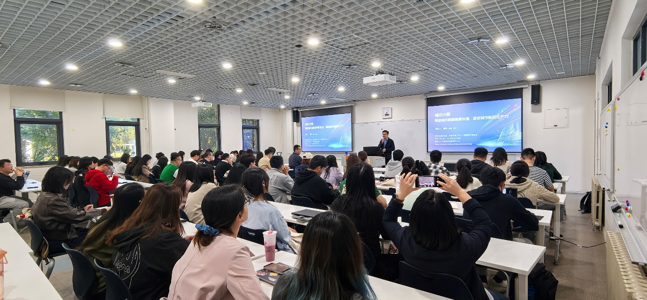 在论讨交流环节,与会师生同郑教授就城市计算过程中的低碳管理、大数据预测模型等问题展开了深入探讨。