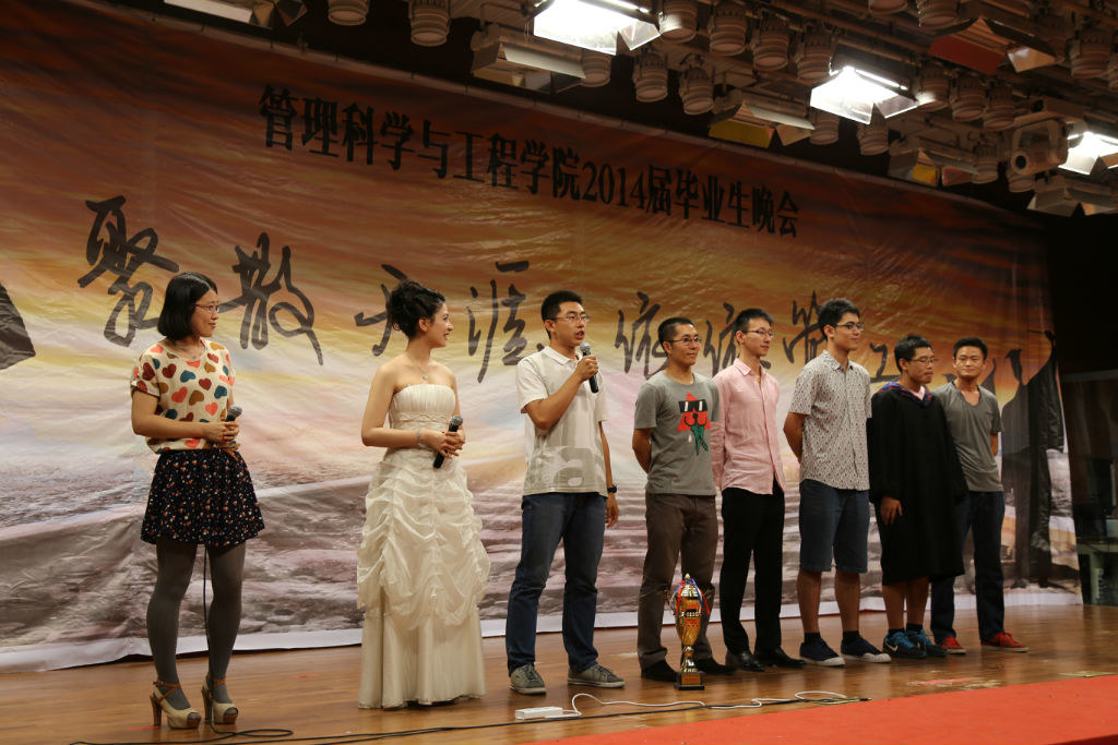 曾经作为主力阵容连续两年问鼎“中财杯”篮球赛冠军的10级的篮球队队员在临别之际对篮球队的寄语,和篮球队视频里的热血激情的比赛画面,让我们重温了那段管工“王朝模式”下激动又感动的时刻。管科10的同学们精心准备的合唱——《时间都去哪了》,让全场观众情不自禁地回忆着一路走来的点点滴滴,他们还将亲手缝制的十字绣牌匾“桃李满天下,师恩似海深”送给了培养他们四年的管理科学系。“今千里,酒一杯,声声喋喋催。问君此去几时还,来时莫徘徊。天之涯,地之角,知交半零落。一壶浊洒尽余欢,今宵别梦寒”,最后,晚会在院员工艺术团的合唱《送别》和《再回首》中落下帷幕。