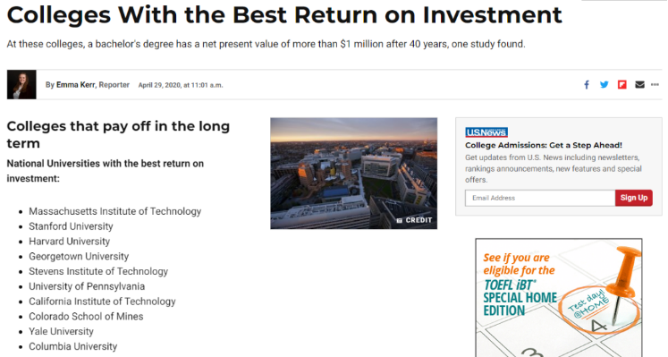2020年美国大学投资回报率最高的大学排名发布了!!!