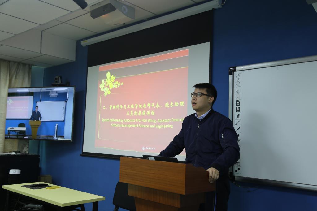 经理助理王昊副教授作为教师代表致辞,他首先祝贺大家的入选项目,并对同学们提出了三点希望和建议:调整状态,明确目标;迎接挑战,勇于开拓;资源共享,协作共赢。在最后,王昊老师希望同学们在学习之余利用好项目搭建的平台和两校的资源,在两年的学习生活中可以收获满满。