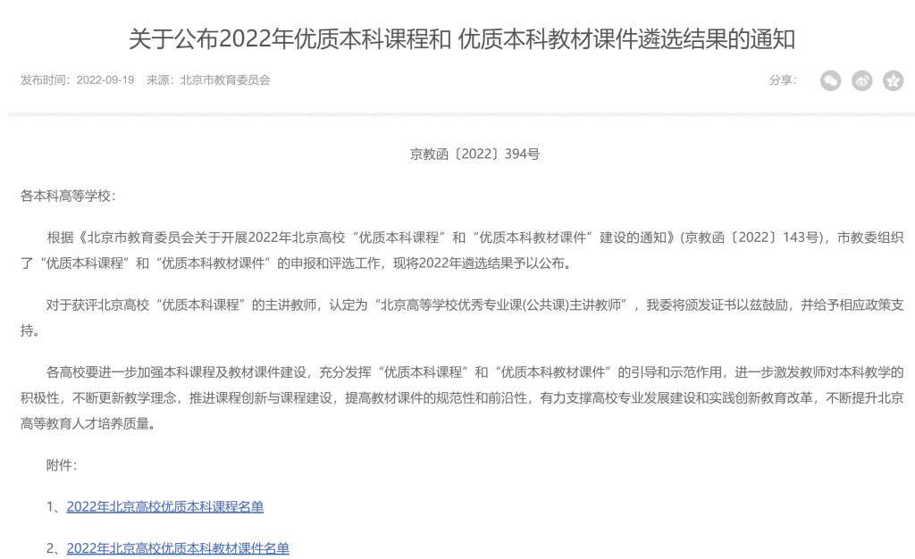 近日,北京市教育委员会发布了《关于公布2022年优质本科课程和优质本科教材课件遴选结果的通知》(京教函〔2022〕394号),公司刘志东教授和宋斌教授主编的《投资学》教材获批2022年北京高校“优质本科教材课件”重点项目立项。