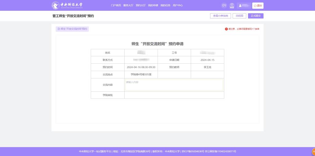 点击“确认预约”后,简要填写拟交流内容后点击“正式提交”,即发送到被预约老师处审批。审批结果将以通知形式反馈到网上师生服务大厅或企业微信号,请预约师生关注。
