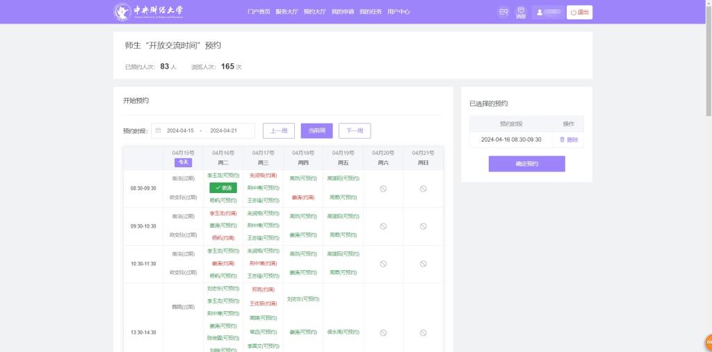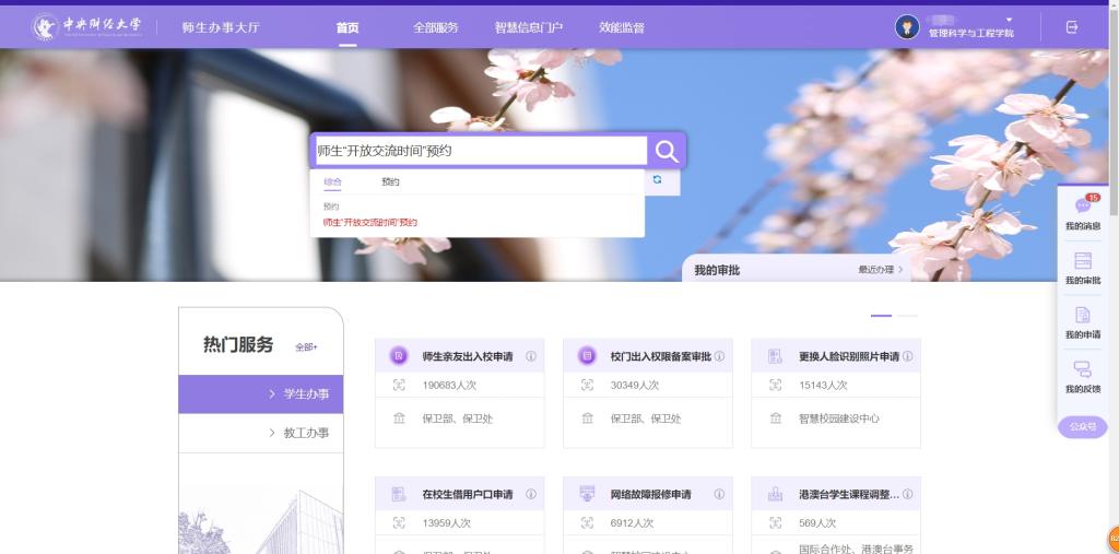 本学期起,公司师生“开放交流时间”使用公司网上办事大厅进行预约,在搜索栏中搜索【师生“开放交流时间”预约】即可进入预约入口。