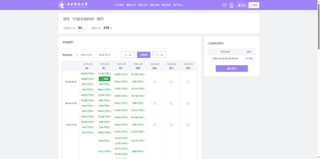 师生可预约次日至7日内的未被预约老师。老师被预约后将显示为“约满”,不再接受预约。每次仅可预约一名老师的一个时间段。