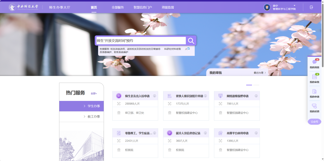 本学期起,公司师生“开放交流时间”使用公司网上办事大厅进行预约,在搜索栏中搜索【师生开放交流时间预约(xc体育)】即可进入预约入口。