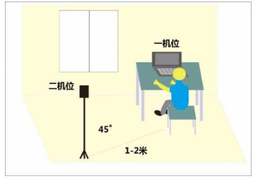 (6.3)硬件要求:考生“双机位”要求。初试笔试、复试面试均需要准备双机位。“第一机位”采集考生音、视频源(考生正前方);“第二机位”采集考生“第一机位”显示器及考生所处环境的整体情况(远端)。“第二机位”须可自由移动,考试过程中考生须根据考官指令随时变换机位位置。“双机位”涉及的硬件设备的电脑桌面以及手机不得存放考试相关的电子资料。考生需要准备可以支撑“双机位”运行的硬件,即需要两部带摄像头的设备及附件,包括笔记本电脑、手机、手机支架、摄像头、麦克风和音响等。第一机位(建议电脑端)从正面拍摄,放置在距离本人30cm 处,确保拍摄到本人上半身、表情、眼神、身后环境;第二机位(建议手机端或者电脑端)从考生侧后方45°距离本人30-80cm 处拍摄,确保从考生身后完整拍摄到考生全身、主机位完整屏幕。手机须在考试期间切断电话、短信服务,屏蔽或拦截所有来电,关闭除考试软件外的一切可影响考试的自启动 app(如 QQ 等语音软件)。用于网络远程考试的手机原则上不能是考生联系方式的手机号码和应急手机号码使用的手机。副机位在考试期间仅开启视频,须关闭麦克风,确保仅主机位传递音频,防止造成混响,同时将设备调整成静音,防止副机位意外放音干扰考生考试。 如遇主机位故障,考生须立即打开副机位音频,通过副机位完成考试。手机在考试期间应保持电量充足,同时提前充值,防止因话费不足被移动信号供应商切断服务。