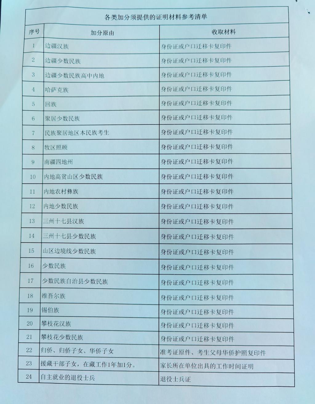 (3)加分资格证明材料。加分资格证明材料为身份证或户口迁移卡复印件的,须在前述(1)(2)材料以外再单独提交一份作为加分证明复核专用。考生本人须在加分证明材料上签字。后期其他有关材料需要考生本人签字确认的另行通知。