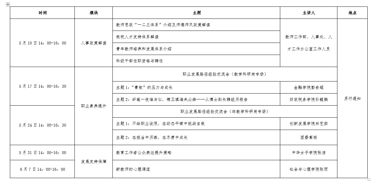 围绕青年教工发展困惑,关注青年教工职业成长,从人事人才政策解读、职业素养提升和发展支持保障三个方面,促进青年教师提升教书育人、学术研究和服务社会的能力,帮助青年教学管理工作人员提高服务公司事业发展的能力。