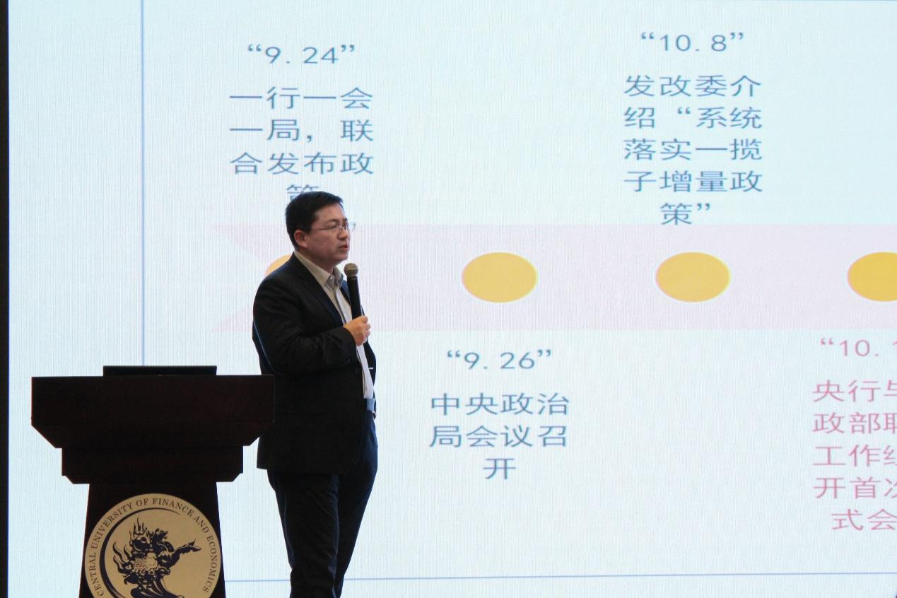 最后,富国基金管理有限公司首席策略分析师、营销管理部副总经理马全胜先生带来了《政策牵引,绝地反击——资本市场策略与展望》的专题讲座,深入回顾A股市场三阶段行情,分析了2024年新版“国九条”对资本市场的影响。他指出,希望同学们能够认识到市场的周期性,尊重市场、理解周期。他建议同学们认真学好专业知识,培养扎实的学科基础和经济素养,养成良好的投资习惯。