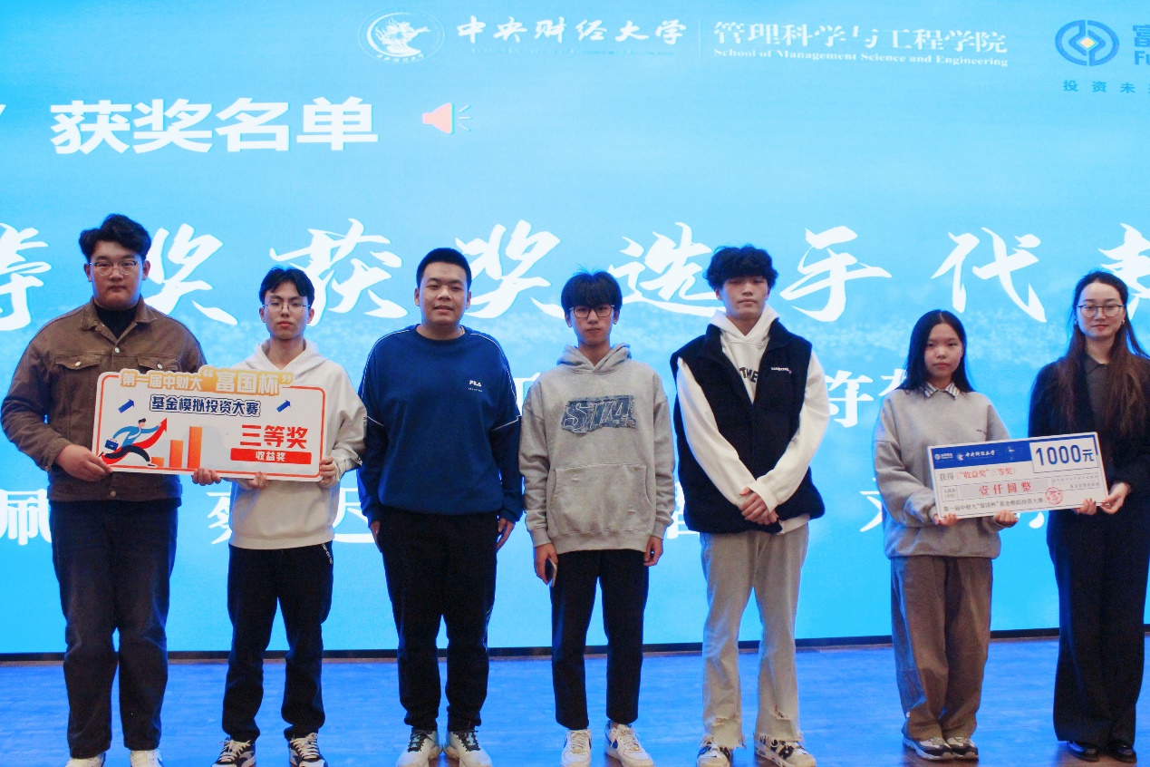 颁奖环节中,主持人宣读了中财大“富国杯”基金模拟投资大赛第一届全程赛“收益奖”和“财经视频奖”的获奖选手名单,由嘉宾依次为获奖同学颁发证书,并与获奖同学合影留念。