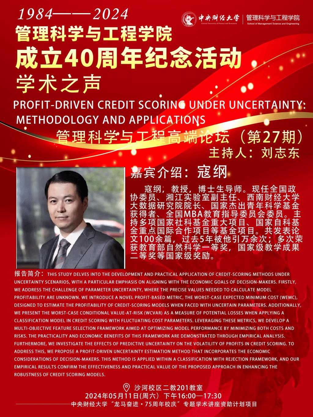 讲座题目:《Profit-Driven Credit Scoring under Uncertainty: Methodology and Applications》