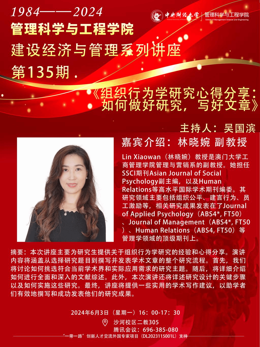 讲座摘要:本次讲座主要为研究生提供关于组织行为学研究的经验和心得分享。演讲内容将涵盖从选择研究题目到撰写并发表学术文章的整个研究流程。首先,我们将讨论如何挑选符合当前学术界和实际应用需求的研究主题。随后,将详细介绍如何进行全面和深入的文献综述。此外,本次演讲还将详述研究设计的关键步骤以及如何实施这些研究。最终,讲座将提供一些实用的学术写作建议,以助学者们有效地撰写和成功发表他们的研究成果。