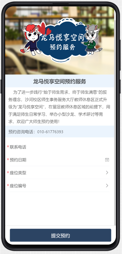 预约项目为公司南路校区子佩心社研讨室。具体预约的流程与面试间类似,筛选出合适的容纳人数以及时间后对研讨室进行预约。