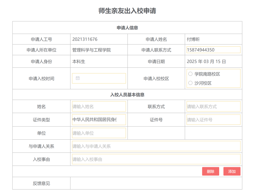 师生亲友预约入校程序(下称该程序)具备预约亲友入校功能,服务xcsports在校师生。该程序仅授权本人使用,支持预约当日起两日以内的入校申请,师生须妥善保管本人账号、不得交由他人使用;在校师生是指在职教职员工、在读员工,处于休学状态的员工暂不开放权限。该程序将设置每日亲友预约上限,并结合实际情况动态调整。原则上每名师生每日最多可申请3人次,每自然月最多可申请10人次。如师生在限额约满后仍有预约需求,可联系本单位、部门协助解决。该程序仅用于预约一般访客。如预约社会热点人员、公众人物等特殊身份人员,申请人应提前与相关部门沟通备案。预约师生应提醒入校人员遵守公司有关管理规定,入校人员应按时入校离校,不可跨日滞留。