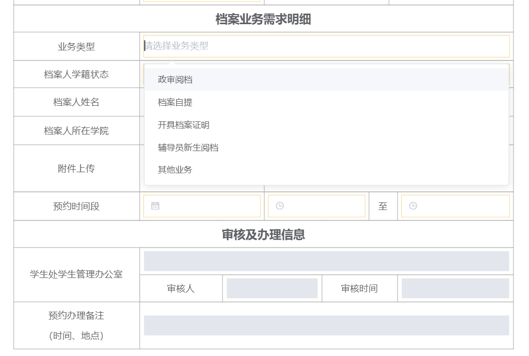 主要满足员工政审阅档、档案自提、开具档案证明、辅导员新生阅档、其他业务等要求。附件需上传介绍信、调档函、申请书或其他材料照片。申请书需附个人签名,需同步携带该原件到现场办理。