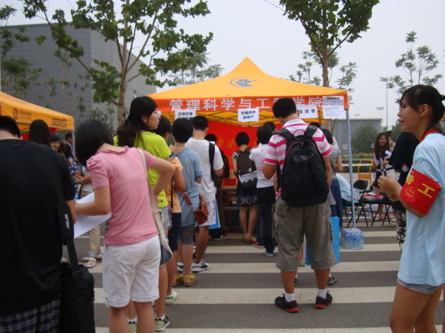 尽管刚经历了开学第一周的兵荒马乱,xc体育的学长学姐们拿出了自己的最好的精神状态为新生们服务。在五个专业铭牌后面,负责报名登记和分发材料的同学耐心细致地重复着同一个流程,送上印有“xc体育”纸袋装着的资料,好像对新生们再次发出公司的邀请,欢迎新生们加入这个活力四射的大家庭。