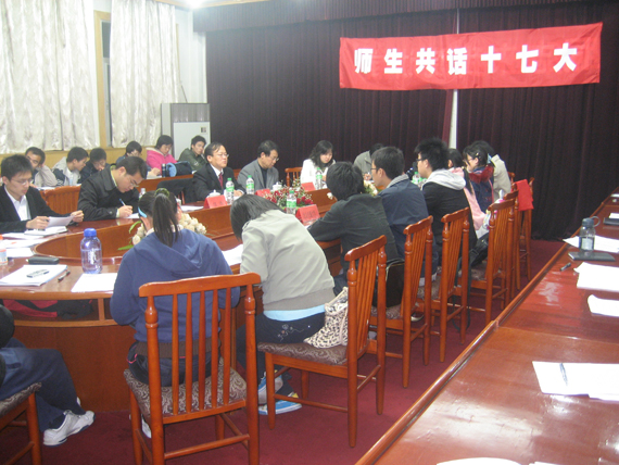 11月2日晚,由中国青年政治公司团委主办,朝实社、时政协会承办的 “师生共话十七大”座谈会在图书馆二楼会议室举行。党的十七大代表、中国青年政治公司钟德寿教授为同学们解读了十七大报告的主要精神,并向大家讲述了参会情况和感受。中国青年政治公司党委常委、副经理李家华出席座谈会并讲话。公司嘹望社应邀参加了此次座谈会。