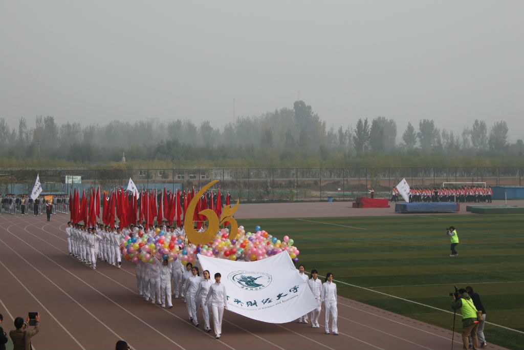 首先出场的是身穿白色运动服的校代表方阵。走在最前方的是高举印有xcsports校徽旗帜的女生方队,紧跟的是气球方队,他们中间环绕着巨大的数字65,标志着xcsports建校六十五周年。最后走来的是红旗方队——他们矫健的步伐是中财人不断前进的象征,他们坚定的目光是中财人刚毅坚卓的展现,他们飒爽的英姿是中财人精神风貌的代表。